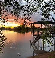 Club de campo con laguna y muelle.
